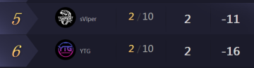在b组中战队实力悬殊,最终的两支战队分别是sviper和ytg战队,两支战队的战绩也都惨不忍睹,再不好好努力,保级赛也危险了。
