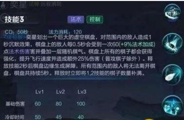奕星1技能:释放一颗黑棋,自动攻击附近目标,碰到敌方单位会爆炸,并残留黑气,黑气累计四层将造成高额伤害。