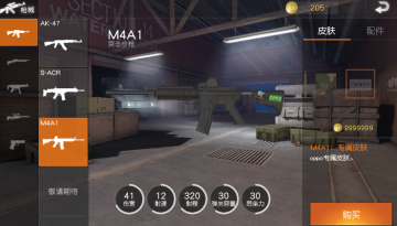 OPPO专属M4A1会在枪托的位置显示OPPO的logo,可以说是很拉风了,不过需要9999999金币才能购买,想来是暂时还没有让玩家购买的想法,不过既然已经做出来了,相信离正式上线也不远了。