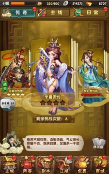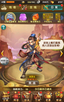3、传奇副本传奇副本是为明朝历史人物和小说人物单独作传,以人物的经历为线索进行设置,玩家在进行挑战之前,还能够查看相关人物传记,满足你作为一个金庸迷、武侠爱好者、明粉的多重爱好哟! 每一关卡挑战成功后,会有侠魂、武魂、经验、银两等奖励;通关还会有突破石、元宝、侠魂珠等奖励。