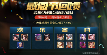 感恩有你,王者峡谷感恩节大回馈,收集兑换永久英雄/皮肤!活动期间,累计登录、参与对局、完成任务即可获得感恩节美食,兑换永久英雄/皮肤等感恩节好礼,不容错过!