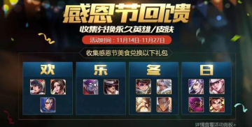 感恩节活动正式上线,做任务得感恩节美食,兑换感恩节礼包,开出永久SNK英雄、永久皮肤、永久英雄。本周活动福利比较明显,100%赠送永久英雄或永久皮肤,这个奖励有一定的随机性,每个礼包会随机产出不同的皮肤和英雄,并非是兑换指定英雄或皮肤,这就需要大家自己去选择把握了。