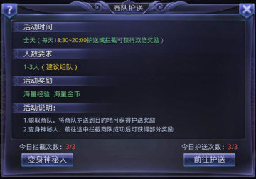 商队护送(每天的18:30-20:00为双倍奖励时间)每天分为护送3次、劫车3次,护送时能添加货物来增加收益。大神建议组满队伍,组高等级高战力的队友,能提高劫车和反劫车的成功率,当然获得的经验也更多!