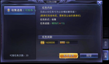 公会日常每天有20环,随等级提升而增加的固定经验,公会每个成员有几率刷出悬赏任务,发布悬赏任务能获得更多经验,帮助公会成员完成悬赏任务也能获得更多经验!