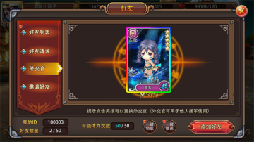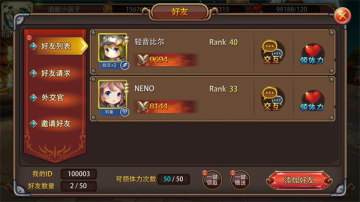 点击社交中的好友,可以在好友列表中与现有的好友互送体力、聊天,好友的最高数量为50人哦~