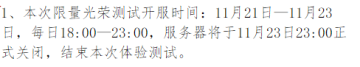 1、本次限量光荣测试开服时间:11月21日—11月23日,每日18:00—23:00,服务器将于11月23日23:00正式关闭,结束本次体验测试。