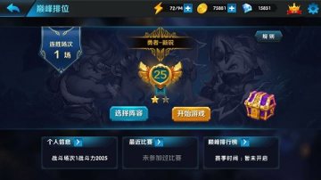通过点击排位战图标,就可以进入到排位战界面,在这里可以看到玩家的战斗信息,也可以点击选择阵容来调整自己的上阵英雄等,点击开始游戏就可以参加排位战斗啦!