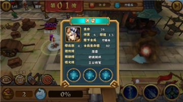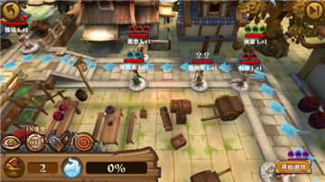 剧情模式下玩家作为防守方,玩法类似于塔防,在地图中标有双剑的地方是可以排布武将的,随着游戏的进行,可以利用获得的粮草安排更多武将以及用于给武将升星,每个武将的属性各不相同,有的可以减速敌人,有的可以造成持续伤害,因此合理分配武将位置和阵容是最重要的策略。