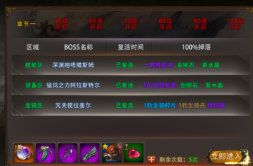 打宝地图是游戏中的特别副本。副本中有三个boss,分别产出装备,技能书和坐骑相关道具材料。每天总共可进入打宝地图5次。从章节三开始每次进入消耗一张副本卷轴。5次机会用完后可通过钻石购买进入地图的次数。每天一共可购买20次,第一次花费20钻石,往后每次需多花费10钻石,以此类推。副本卷轴也可以直接购买,20钻石一张。不同等级解锁的打宝地图boss掉落也不同。章节2后解锁宠物boss,掉落宠物相关道具。具体掉落可在界面上直观查到。Boss战力不低,且地图时间限制在1小时,如果要一趟刷完四个boss,必须拥有该等级的强力强化装备。技能书除了直接钻石购买外就只有打宝地图的boss掉落,是提升实力的必须途径。需要注意的是地图的boss属于世界boss,拥有独立的刷新时间。每次被击杀后1小时15分钟才会刷新,所以每天合理安排打宝时间也是很重要的。