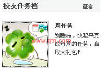 第二步:在你的QQ校友右边的下面有一个:周任务 别睡啦,快起来完成每周的任务,赢取大礼包!看图: