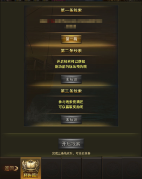 玩法:每一个功能预告包含3个线索,每个线索都会有线索任务和线索竞猜。完成线索任务和竞猜后,可开启线索。如果竞猜对了线索答案,会有奖励,猜错没有。当三个线索全部完成后,可开启下版本更新预告