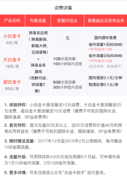 据官方介绍,白金卡分为小白金卡、大白金卡、超白金卡三种套餐。白金卡用户在使用网易全系应用所耗费的流量全部免除,此外,爱奇艺作为白金卡的合作伙伴之一,也将为用户提供免流体验。