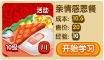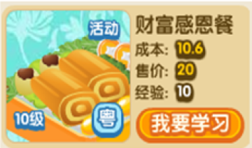 答:为照顾不同等级的用户参加活动时都能够得到尽可能多的收益,活动菜肴分布在5级和10级两个等级。活动菜肴的学艺时间和成本都大大降低,学艺时间只需要1.98小时,成本只需要1300金币。