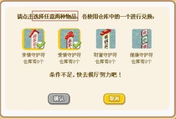 2:玩家学艺的规则与原来一样,不能超级学艺。非本菜系的菜需要到好友家去学习,学成后开始出售,任一活动菜肴卖出5000份,就可以兑换相应的守护符。