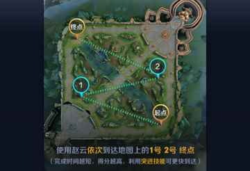 技能训练穿墙移动关卡,您将使用英雄赵云一次到达地图的上指定的点,您可以利用赵云技能的突进效果快速到达,您还可以将您的成绩分享到社交平台。