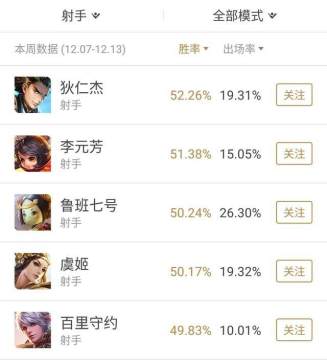 而出场率不到20%的狄仁杰却又是登上射手一哥宝座,并且已经是蝉联了许久的第一。