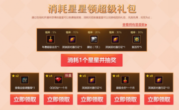 4、通过在线和开通所获得的星星可用于抽奖和兑换礼包,消耗对应数量的星星可以兑换超级会员和红钻,单Q限1次,深渊票兑换礼包单Q限制5次;