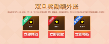 活动期间:2017年12月24日~25日、2018年1月1日~1月2日分别可以额外领取一颗星星,单Q每日限领1次,同时参与开通的玩家可以额外领取2颗星星。