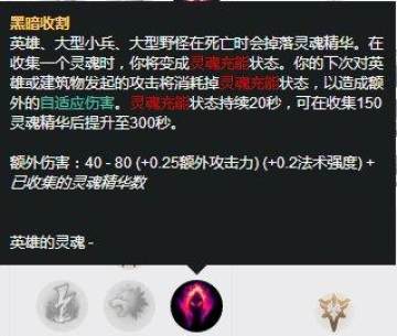 黑暗收割在收集灵魂时,下次对英雄造成额外伤害,在新模式由于80%的冷却CD,无论是清野还是清兵都非常快,很容易就叠加灵魂,从而可以对英雄造成的伤害非常爆炸。