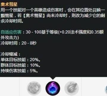 使用技能造成伤害时,会召唤一颗彗星造成额外伤害,在新模式中对于Poke型英雄非常的OP,80%的冷却CD技能命中敌人时可以减少这个奥术彗星冷却CD,刷新速度非常快。