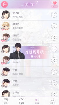 点开手机界面,可以看到手机一共有四个功能,分别是“信息”、“朋友圈、“录音”和“公众号”,仿佛是恋语世界中的“微信”。在信息界面会收到角色发来的信息,和角色聊天可以增加角色的好感度。在聊天过程中,四个主角迥异的个性一览无遗,角色的形象也因此变得立体起来。