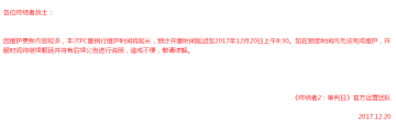 因维护更新内容较多,本次例行维护时间将延长,预计开服时间延迟至2017年12月20日上午9:00。如在预定时间内无法完成维护,开服时间将继续顺延并将有后续公告进行说明,造成不便,敬请谅解。