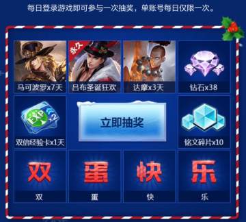 活动奖品:永久圣诞狂欢皮肤+双蛋快乐四个字(集齐兑换7天传说皮肤体验卡)