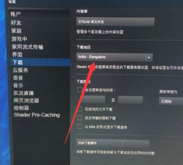 2、在设置的界面点开,找到下载一栏,点击更换下载地区,在这里要注意一下了,很多玩家都会在中国的节点上进行更换,其实按照不同地区的网络不同的节点是有不同的效果的,大家不妨切换成印度节点或者是台湾、香港节点进行下载更新。