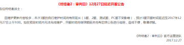 因维护更新内容较多,本次例行维护时间将延长,预计开服时间延迟至2017年12月27日上午9:00。如在预定时间内无法完成维护,开服时间将继续顺延并将有后续公告进行说明,造成不便,敬请谅解。