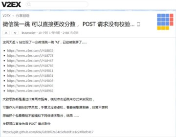 V2EX网站一篇题为《微信跳一跳 可以直接更改分数,POST请求没有校验…》的文章获得大量曝光,帖中指出微信小程序存在漏洞,跳一跳小游戏可以直接改分数。