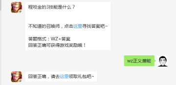 题目:程咬金的3技能是什么? 答题格式:wz+答案,今天的王者荣耀答案小编为大家整理好了,希望对玩家获得微信额外的奖励有帮助,不清楚1月5日王者荣耀游戏每日一题答案的玩家速来看看,希望对大家获得腾讯微信免费发放的奖励有帮助。