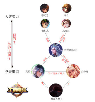 可以看出明世隐的人物关系图,主要分为两部分:一边是长安城,目测受得了武则天的重用;另一边是“尧天”。长安城中大唐势力包括武则天、狄仁杰、李白和李元芳就多介绍了。至于“尧天”,是在王者峡谷中继长城小分队的另一个组织,暂时包括明世隐、公孙离、弈星和一个神秘人物。