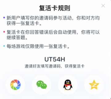 2、每次邀请一位新朋友,你和对方就各自获得一张复活卡。邀请码分享:UT54H,也就是说邀请码可以让双方再复活一轮哦。
