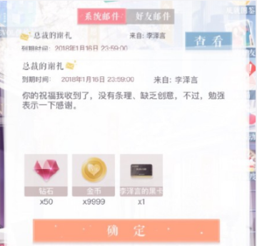 谢礼中包括了50个钻石,9999个金币和李泽言的黑卡。