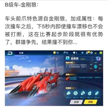 金刚狼作为一款个性赛车,霸气的狼爪外形,让这款车拥有十足的侵略性。而且金刚狼还有特性:每次撞车之后,下5秒内即使撞车漂移也不会被打断,这在比赛起步阶段就很有优势了,群雄争先,结果撞不到你...