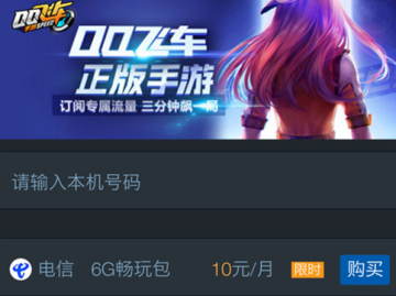 之后输入自己的手机号码,目前QQ飞车手游仅支持电信以及联通,电信10元一个月,联通9元一个月,输入之后会识别号码,然后点击购买即可。