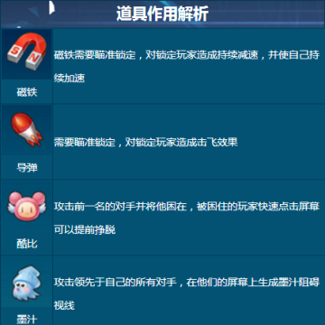 吸铁石属于损人利己的道具,释放它不仅能干扰对手,同时可以给自己带来加速。那么释放的时机就变得十分重要,最好选中最前方的玩家,不过会让你和对手撞在一起,造成损人不利己的尴尬场面。