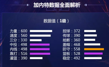 在游戏中加内特的属性非常全面,初始数值内线498,靠打516,防守558,篮板528,中投498。游戏属性可以看出加内特是一位全能的大前锋,内线、中投样样精通,还有优秀的防守和篮板球能力。