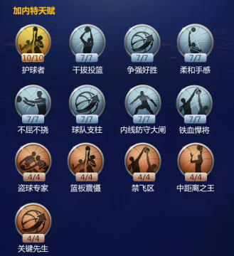 加内特的天赋技能10级的有护球者,7级的有干拔投篮、争强好胜、柔和手感、不屈不挠、球队支柱、内线防守大闸和铁血悍将,4级的有盗球专家、篮板震慑、禁飞区、中距离之王和关键先生。