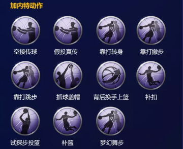 加内特的动作有空接传球、假投真传、靠打转身、靠打撤步、靠打跳步、抓球盖帽、背后换手上篮、补扣、试探步投篮、补篮和梦幻脚步。加内特拥有梦幻脚步动作,作为最强内线能力之一,足以证明KD非常适合当前版本。