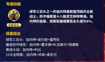 加内特的专属技能是“全能战士”,绿军三巨头之一的加内特是联盟顶级的全能战士,防守端更是十八般武艺样样精通。加内特的篮板、抢断和盖帽属性永久提升8%。这8%属性的提升,让加内特镇守的内线密不透风!