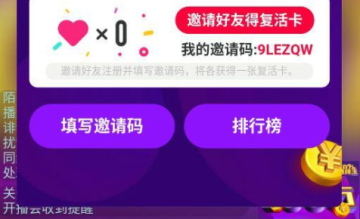 5.这里我们可以看到自己的要有邀请码,填写好友的邀请码可以领取复活卡一张,我们填写“9LEZQW”领取一张复活卡!