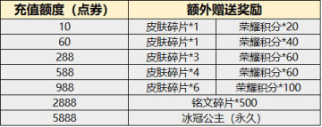 累计充值送大量皮肤碎片、荣耀积分、铭文碎片,更有雅典娜史诗皮肤-冰冠公主等你来拿!