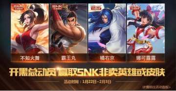 参与活动将获得SNK专属碎片,兑换SNK正版授权英雄/皮肤,更有机会获得永久内测专属皮肤等好礼!(具体开启时间请关注后续官网公告)