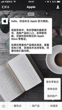 1月18日,苹果推出了微信公号“Apple”,该公众号提供了关于苹果的最新资讯、选购产品的入口、各种新技能,还能找到你附近的Apple Store零售店,同时支持微信支付。
