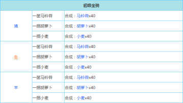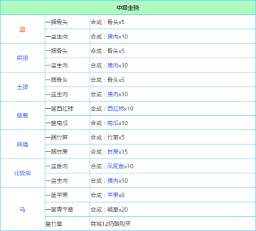 马:皇竹草(商城12奶酪购买);一筐苹果(8个苹果合成);一筐青干草(20个碱草合成)