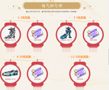 截止2月25日23:00,福气排行榜上前100名的车手将获得以下奖励哦!