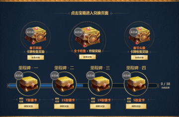 本次齐聚春晖集卡活动总共包含38张卡牌,其中白银等级卡牌与黄金等级卡牌各19张,三张相同白银等级卡牌可以合成为一张对应的黄金等级卡牌