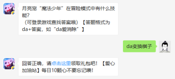 作者:网友整理 人气:0月亮宠“魔法少年”在冒险模式中有什么技能?(可登录游戏查找答案哦)【答题格式为da+答案,如“da爱消除”】在今天的天天爱消除的每日一题中有问到天天爱消除月亮宠魔法少年技能的有关问题,很多玩家是不是还不知道呢?正确答案是da变换棋子哦,一起来看看这个月亮宠魔法少年技能的详细解读吧。