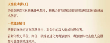 络新妇的被动是携带三只狼蛛进行战斗,狼蛛也会攻击络新妇所攻击的目标。而一技能则是毒针,向指定方向跳跃扑击,对命中的敌人造成物理伤害。